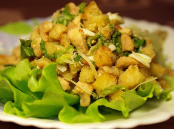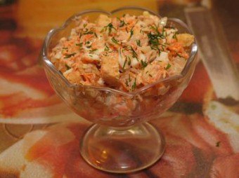 - عندما يكون zazharka جاهزًا ، قم بتهدئته وإرساله إلى الثلاجة ، مع الخلط مع البسكويت. دع وجبة خفيفة تبقى هناك لمدة 10 دقائق. في النهاية ، ضعي السلطة مع الصلصة المختارة ، وزينها وخدميها في المائدة.